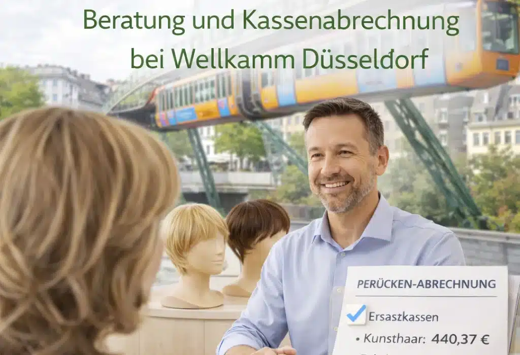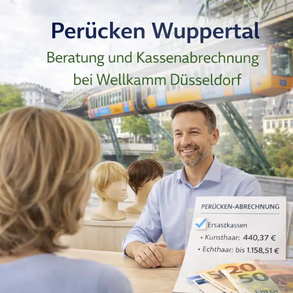 Wer in Wuppertal eine Perücke bei medizinischem Haarausfall sucht, steht schnell vor einer schwierigen Entscheidung: Die lokalen Angebote sind überschaubar, und eine spezialisierte Beratung für Krebspatientinnen oder Menschen mit Alopezie ist in Wuppertal kaum zu finden. Mein Zweithaarstudio Wellkamm in Düsseldorf ist dabei nur 25 Minuten entfernt – und ich berate Kundinnen aus Elberfeld, Barmen, Vohwinkel und dem gesamten Bergischen Land seit 1993 persönlich. Stand März 2026 übernehmen die gesetzlichen Krankenkassen bei medizinisch bedingtem Haarausfall bis zu 1.158,51 Euro für eine Echthaarperücke. Als zugelassener Kassenpartner rechne ich direkt mit Ihrer Krankenkasse ab, sodass Sie weder vorausbezahlen noch Formulare selbst einreichen müssen.